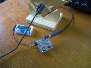 | ループアンテナは一辺46cmの正方形の木枠にエナメル線を12回巻いたものです。これとAM用単連ポリバリコンの組み合わせで同調回路を形成します。この巻数で中波放送の周波数をほぼカバーするようです。これにFET2石で組んだ高周波プリアンプを通してAMラジオのフェライトアンテナに数回巻いたコイルに接続します。 アンテナを兼ねた12回巻のコイルとポリバリコンによる同調回路からの信号を1回巻のピックアップコイルで取り出し,プリアンプを通してラジオに送ります。緑色の細い線が1回巻きのピックアップコイルです。 プリアンプは約4cm×4cmの汎用基板に組み込みました。双極双投トグルスイッチを用いて,プリアンプの電源を入れないときはピックアップコイルの出力を直接ラジオに送るようにしています。 プリアンプの回路はミズホの中波用ループアンテナUZ−8DXに付属のプリアンプ回路をそのまま利用させてもらいました。 回路図はインターネットで検索すれば入手できます。増幅回路は初段が2SK241によるソース共通回路,2段目が2SK192Aによるソース・フォロワです。部品代は1000円位です。単3電池2本の3Vで駆動します。プラグとジャックを直接基板にハンダ付けしています。 ラジオはSONYのICF−6700です。本来のアンテナ端子の隣に新たにアンテナ接続用のジャックを増設しました。ここにアンプ基板のプラグを接続します。 受信は,まずプリアンプの電源を入れないで使用します。チューニングメーターが最も振れるようにバリコンとアンテナの向きを調節します。ループアンテナだけでもかなり有効です。そのうえで受信状況によってプリアンプの電源を入れます。 写真は周波数1314kHzのラジオ大阪OBCを受信中の様子です(当地は新潟市です)。プリアンプがうまく生かされている例の1つです。左がプリアンプを通さないとき,右が通したときです。かなり快適な受信状態になります。 強力な局の近くでかき消されがちな微弱な局を受信する場合もループアンテナの指向性とプリアンプの組合せは有効です。ループアンテナの向きで強力な局をはずしておいて,微弱な局をプリアンプで拾うという手法が使えます。 当地は新潟市です。時間帯ににもよりますが,この組合せで次のような局を受信できています。